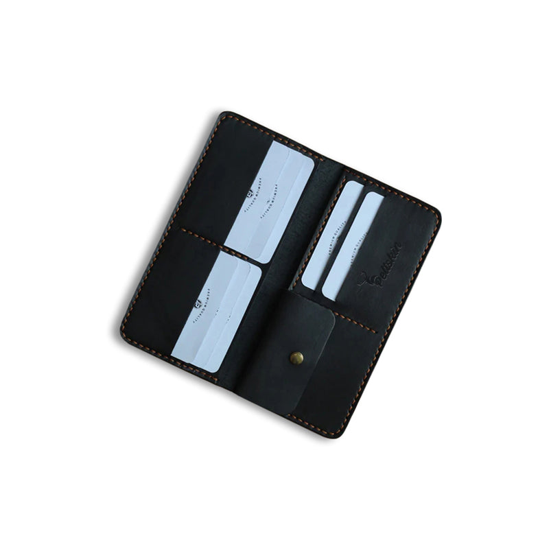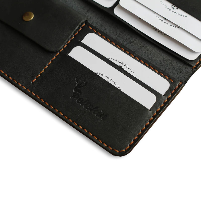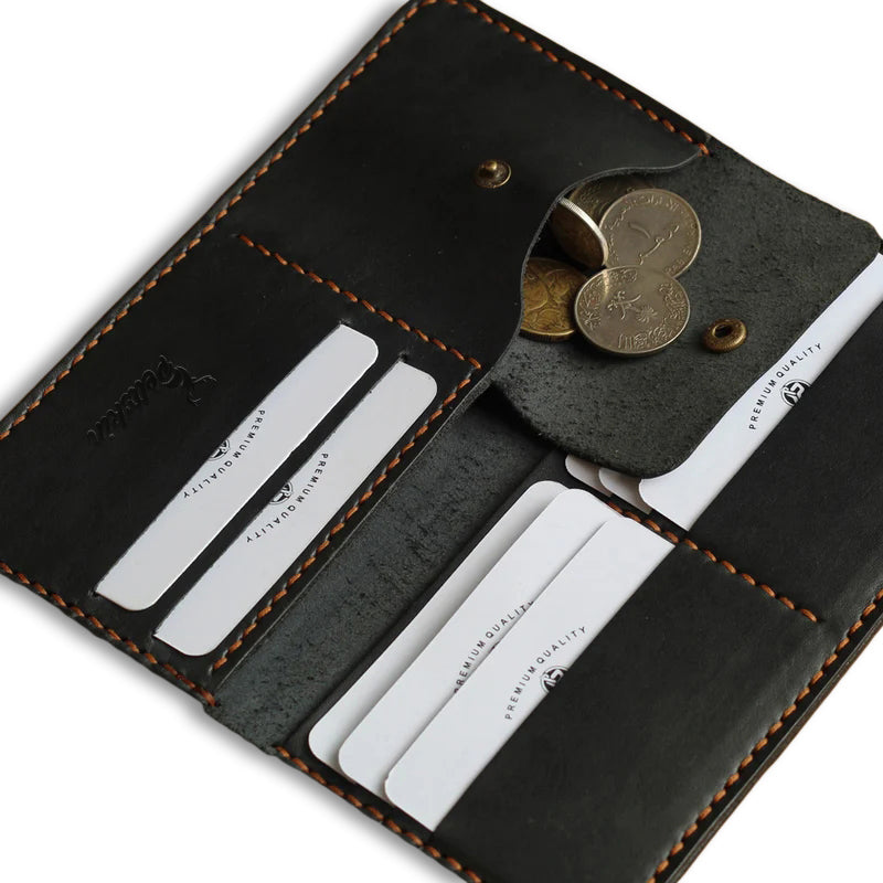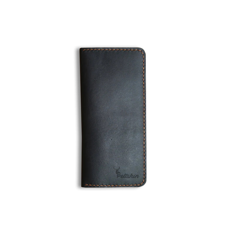 The Peltskin L1.5 Long Wallet in Jade Black is the ideal companion for those who carry it all—cash, cards, coins, and receipts. Made from premium veg-tanned leather, this sleek and spacious wallet offers both practicality and style. Expertly stitched with durable, imported nylon-waxed thread, the wallet is further polished to a beautiful, shiny finish. The edges are hand-burnished to perfection, adding a refined touch to this high-quality piece.